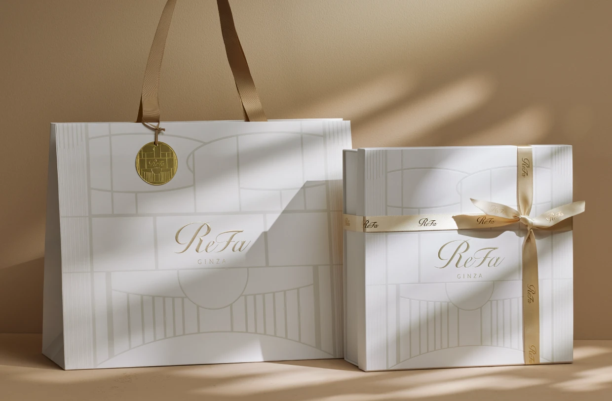 ReFa GINZAのシンボルであるスフィア空間をモチーフとした、ショッピングバッグ、ボックス、リボン、チャームからなる銀座限定のギフトラッピングサービスです。お好きな商品1つからギフト包装いたします。