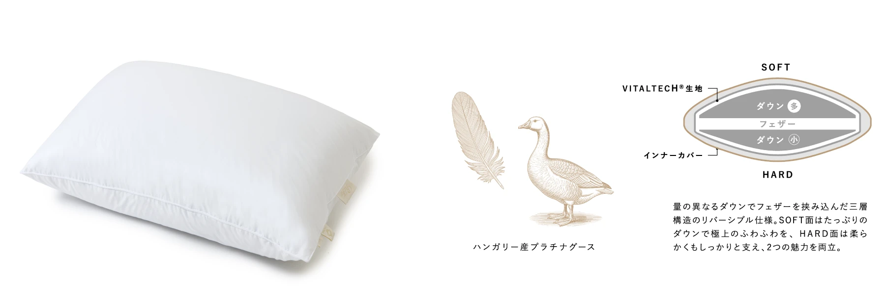 三層構造で沈み込むような柔らかさと、首を支えるサポート性を両立したリバーシブル仕様。極上の眠りへといざないます。